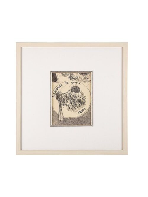 Sketch Capri çerçeve, kağıt üzeri baskıdır. Capri adasındaki deniz mahsullu bir tabağı resmeden bu çerçeve sade renkleri ile her mekana uyum sağlar. Aynı seriye ait diğer eşleri ile de çoklu kombinlenebilir.