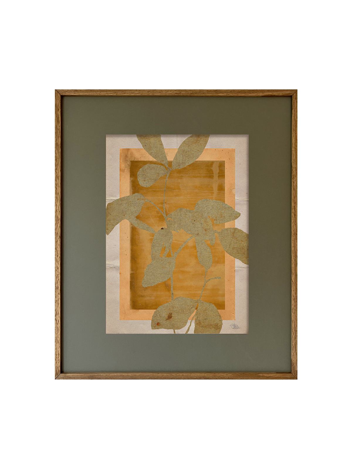 Renk: Turuncu ve bej renkli desen / Yeşil paspartu / Meşe rengi ham ahşap çerçeve.